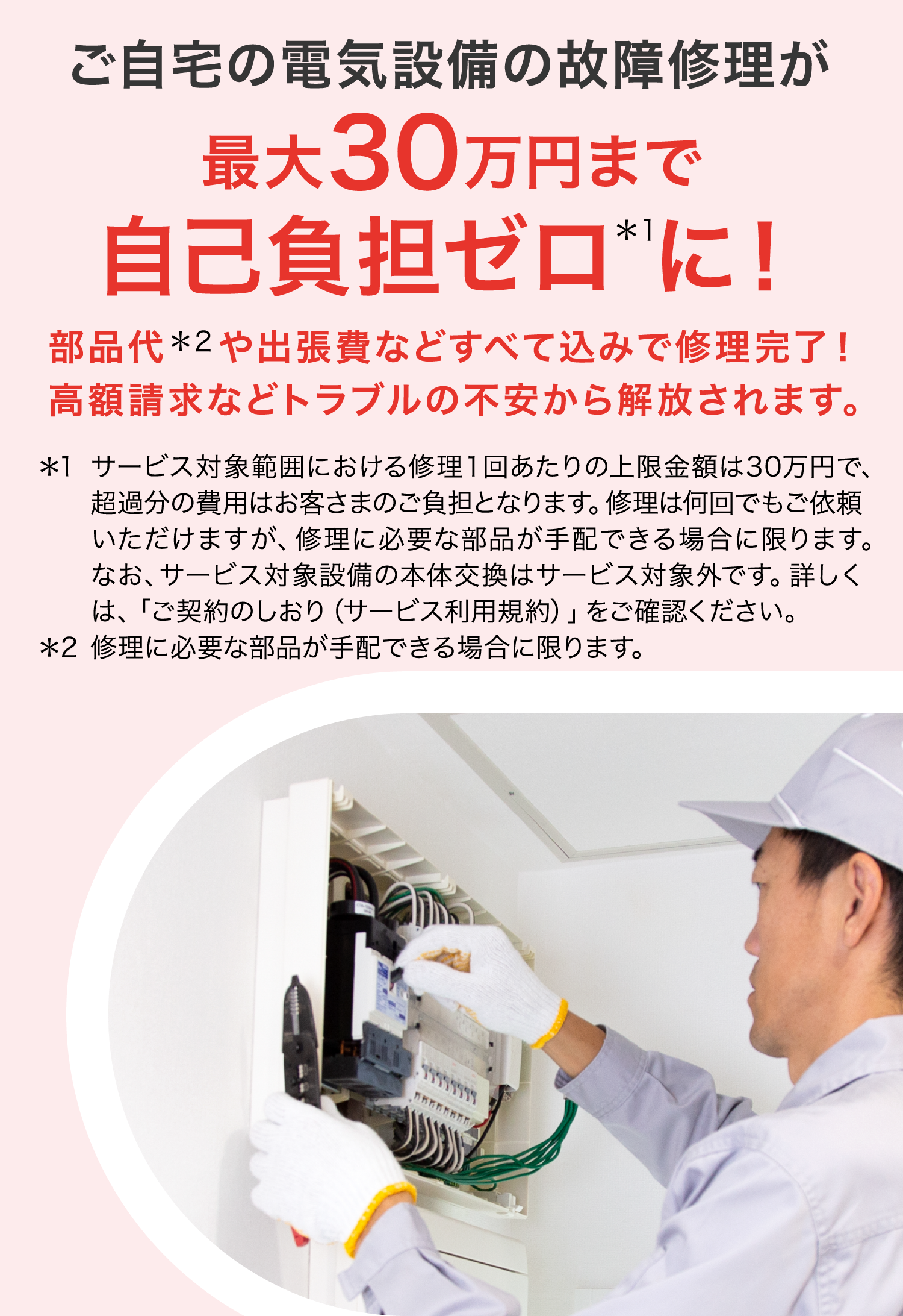 サービス対象範囲における修理1回あたりの上限金額は30万円で、超過分の費用はお客さまのご負担となります。修理は何回でもご依頼いただけますが、修理に必要な部品が手配できる場合に限ります。なお、サービス対象設備の本体交換はサービス対象外です。詳しくは、「ご契約のしおり(サービス利用規約)」をご確認ください。
