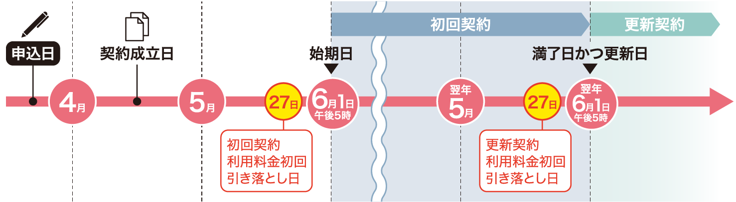 以降毎年5月27日が引き落とし日となり、6月1日(午後5時)に契約満了・自動更新となります。