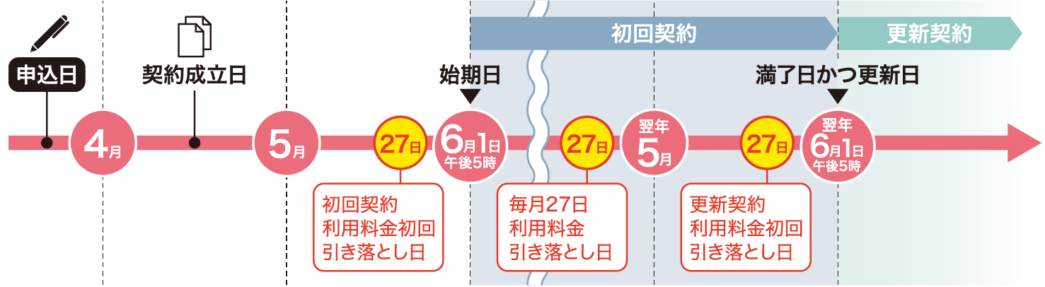 以降毎月27日が引き落とし日となり、翌年6月1日(午後5時)に契約満了・自動更新となります。