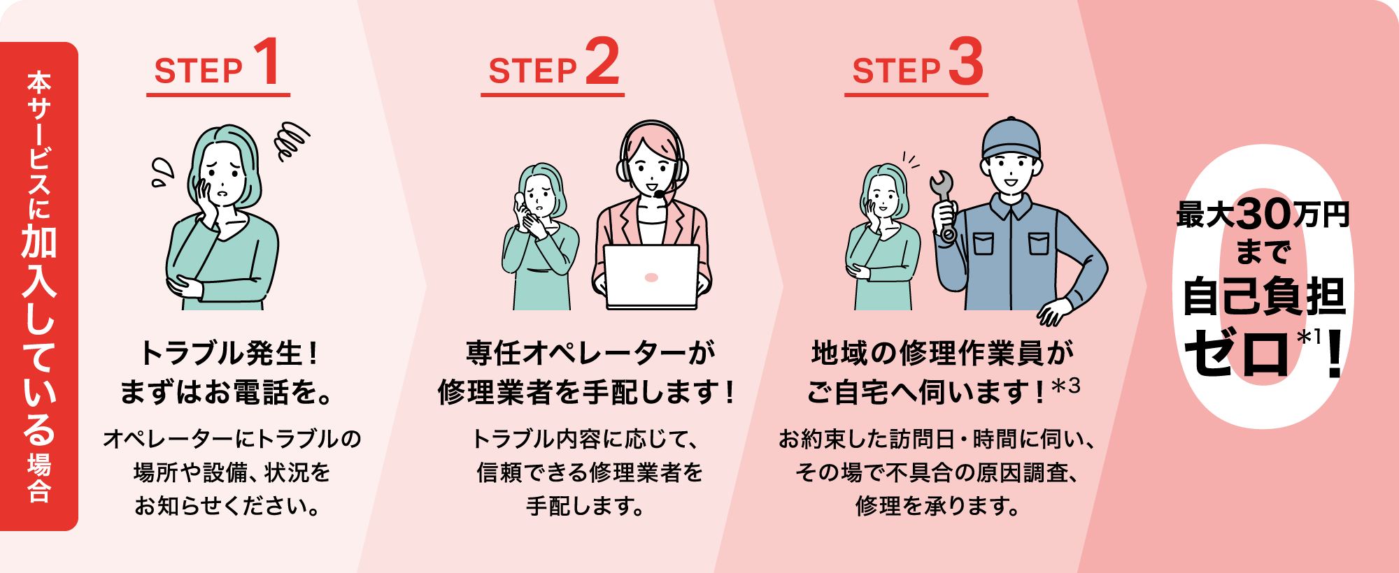 - サービス対象範囲における修理1回あたりの上限金額は30万円で、超過分の費用はお客さまのご負担となります。修理は何回でもご依頼いただけますが、修理に必要な部品が手配できる場合に限ります。なお、サービス対象設備の本体交換はサービス対象外です。詳しくは、「ご契約のしおり(サービス利用規約)」をご確認ください。