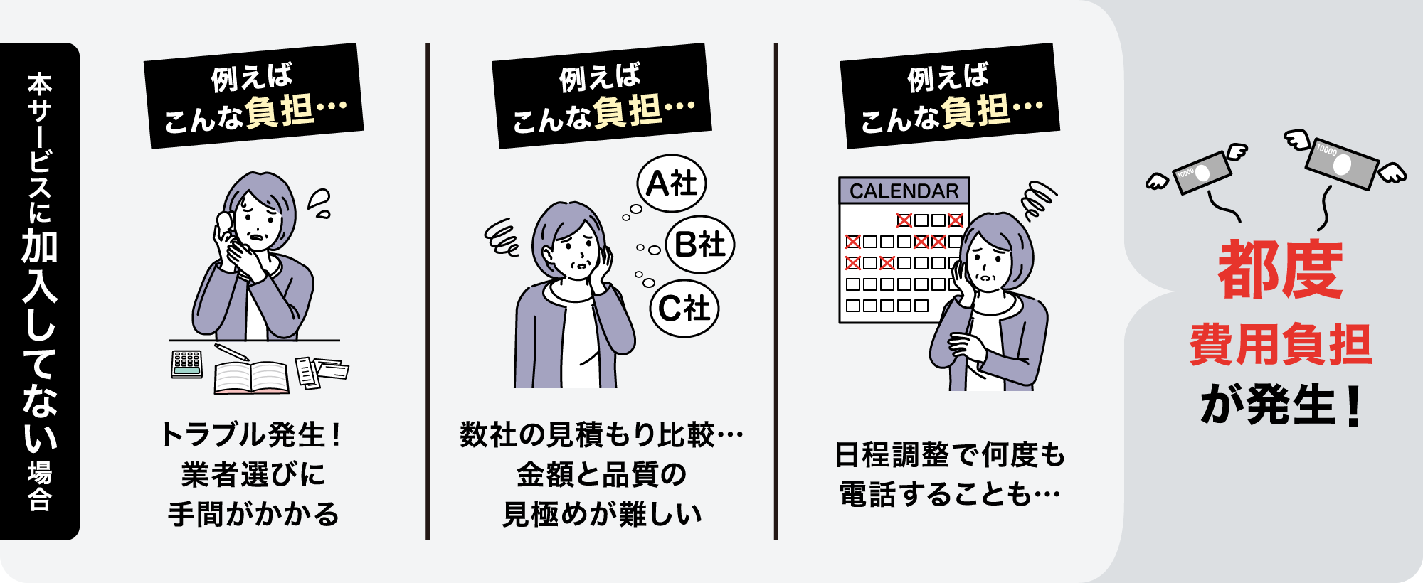 一般的な駆け付けサービスの料金は「都度見積もり」方式。見積額や品質は業者によるばらつきが大きくなりがちです。はぴe暮らしサポート 電気設備修理パックなら、手頃な定額のサービス利用料金で最大30万円まで修理費の自己負担がゼロ*1に。想定外の出費が発生する心配がありません。